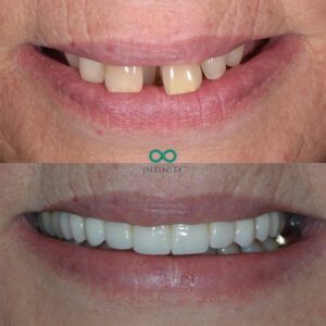 I completed the treatment for our patient this week to replace almost all of her upper teeth. She presented to our clinic with most of her upper teeth failing due to advanced periodontal disease. This is a severe form of gum disease that had resulted in significant bone loss which resulted in these teeth becoming loose.